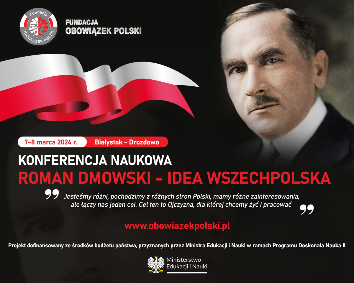 Zadanie „Siła narodów według Romana Dmowskiego” sfinansowano ze Ministerstwa Edukacji i Nauki z programu Doskonała Nauka – Wsparcie konferencji naukowych